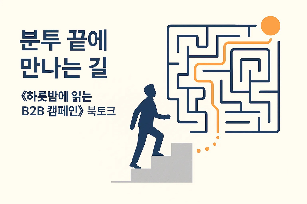 내용 | • 하룻밤에 읽는 B2B 캠페인의 핵심 메시지를 현장 중심의 대화로 풀어내어 실무적 인사이트 제공 • 업계 종사자들이 각자의 경험과 분투기를 공유하며 공감과 네트워킹의 장 형성 • AI와 RevOps 시대에 변하지 않는 마케팅의 본질을 재확인하고, 참가자들이 실행 가능한 힌트 제공 |